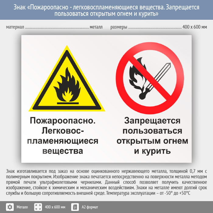 Знак «Пожароопасно - легковоспламеняющиеся вещества. Запрещается пользоваться открытым огнем и курить», КЗ-70 (металл, 600х400 мм) в Улан-Удэ купить