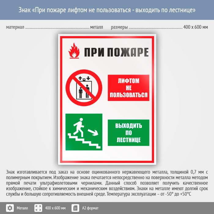 Знак «При пожаре лифтом не пользоваться - выходить по лестнице», КЗ-73 (металл, 400х600 мм) в Улан-Удэ купить