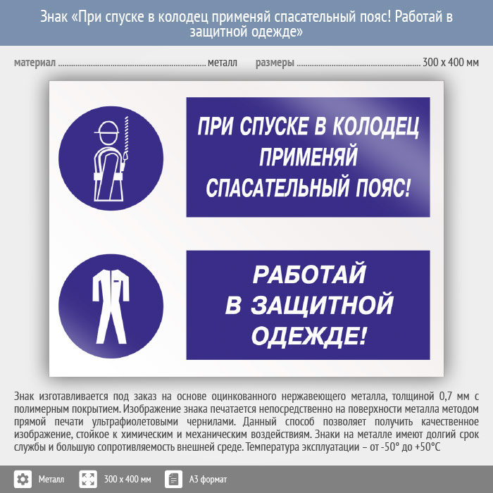 Знак «При спуске в колодец применяй спасательный пояс! Работай в защитной одежде», КЗ-76 (металл, 400х300 мм) в Улан-Удэ купить