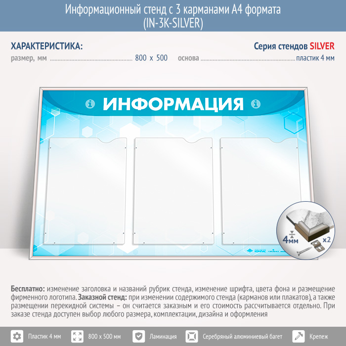 Информационный стенд с 3 карманами А4 формата (IN-3K-SILVER) в Улан-Удэ купить