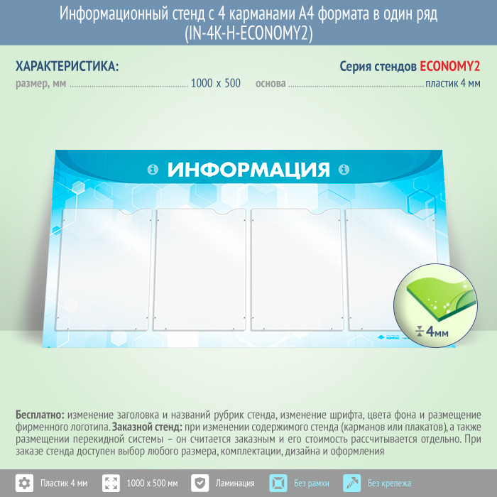 Информационный стенд с 4 карманами А4 формата в один ряд (IN-4K-H-ECONOMY2) в Улан-Удэ купить