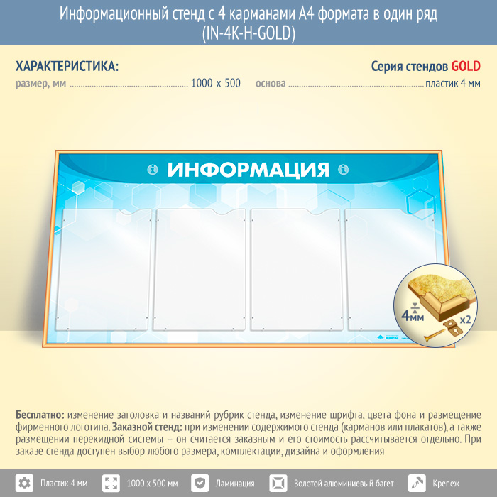 Информационный стенд с 4 карманами А4 формата в один ряд (IN-4K-H-GOLD) в Улан-Удэ купить