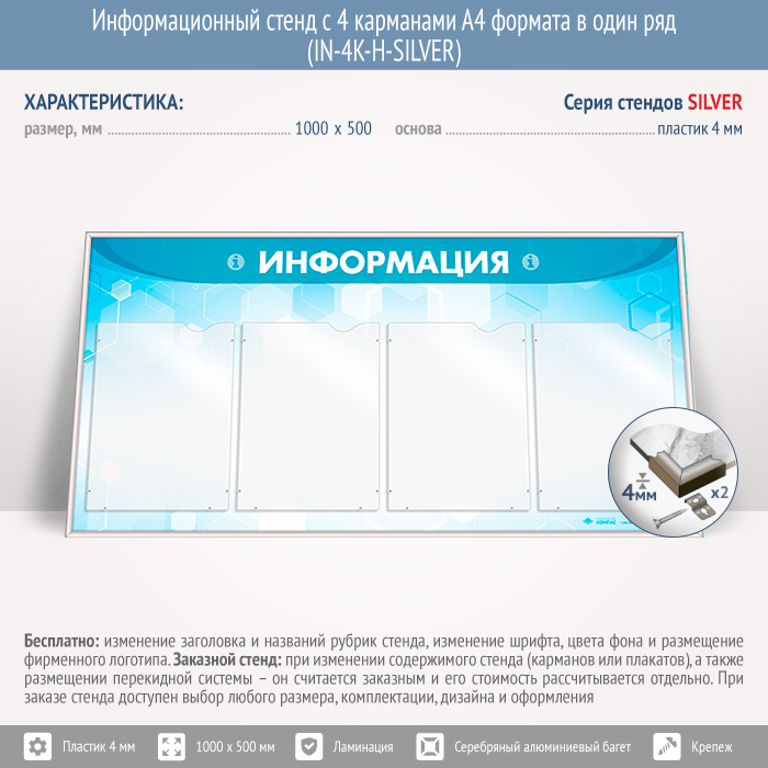 Информационный стенд с 4 карманами А4 формата в один ряд (IN-4K-H-SILVER) в Улан-Удэ купить