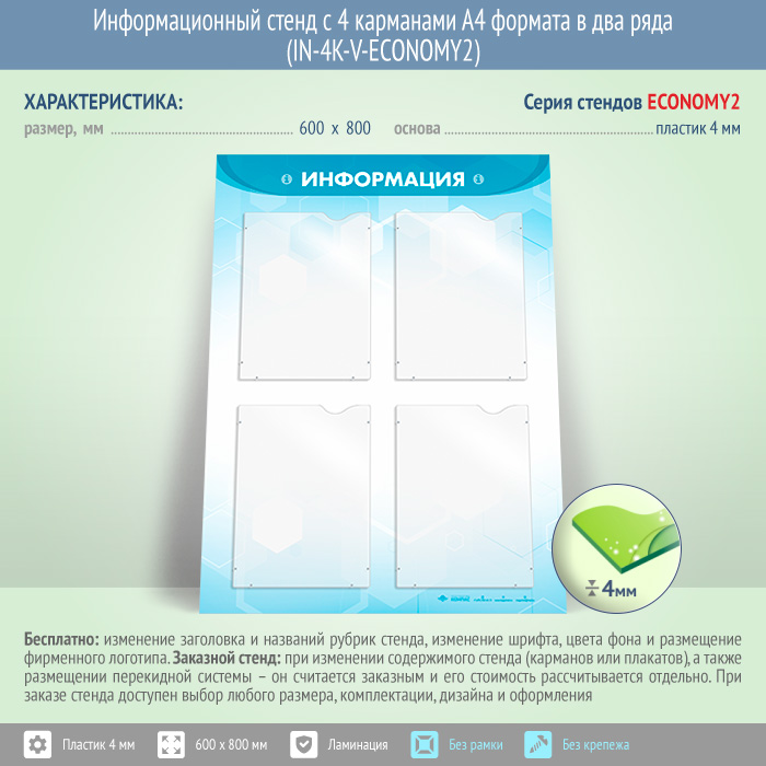 Информационный стенд с 4 карманами А4 формата в два ряда (IN-4K-V-ECONOMY2) в Улан-Удэ купить