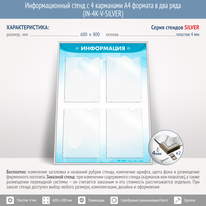Информационный стенд с 4 карманами А4 формата в два ряда (IN-4K-V-SILVER) в Улан-Удэ купить