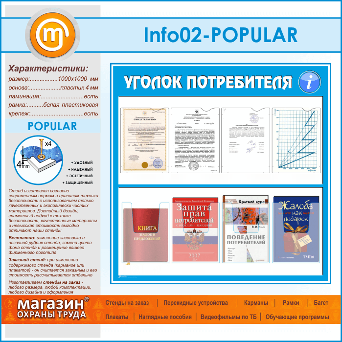 Стенд «Уголок потребителя» с 4 плоскими и 4 объемными карманами А4 формата (IN-02-POPULAR) в Улан-Удэ купить