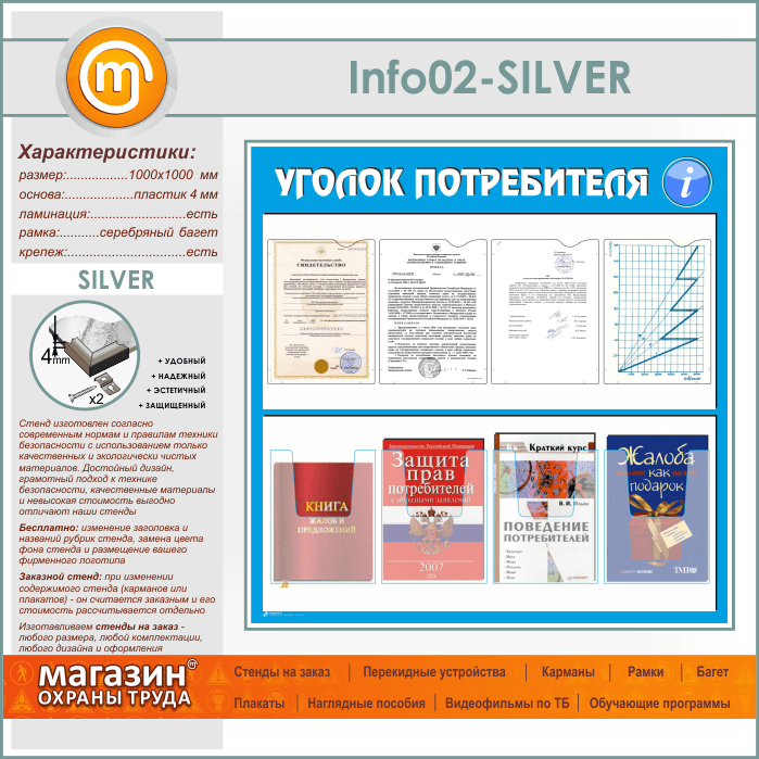 Стенд «Уголок потребителя» с 4 плоскими и 4 объемными карманами А4 формата (IN-02-SILVER) в Улан-Удэ купить