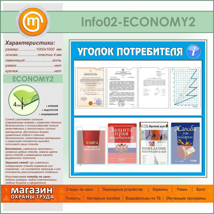 Стенд «Уголок потребителя» с 4 плоскими и 4 объемными карманами А4 формата (IN-02-ECONOMY2) в Улан-Удэ купить
