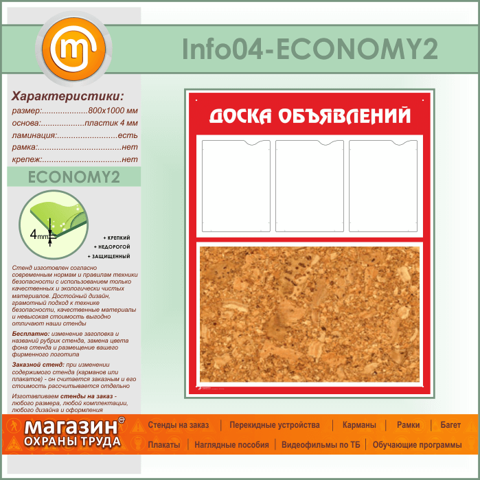 Стенд «Доска объявлений» с пробковым полотном и 3 карманами А4 формата (IN-04-ECONOMY2) в Улан-Удэ купить