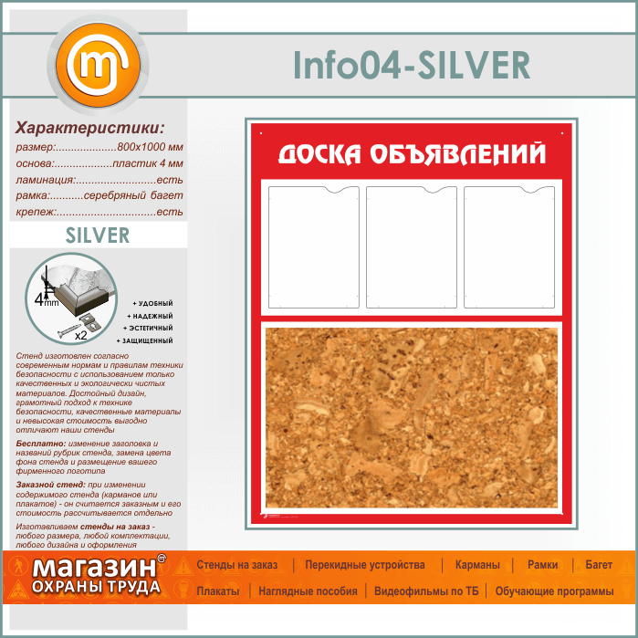 Стенд «Доска объявлений» с пробковым полотном и 3 карманами А4 формата (IN-04-SILVER) в Улан-Удэ купить