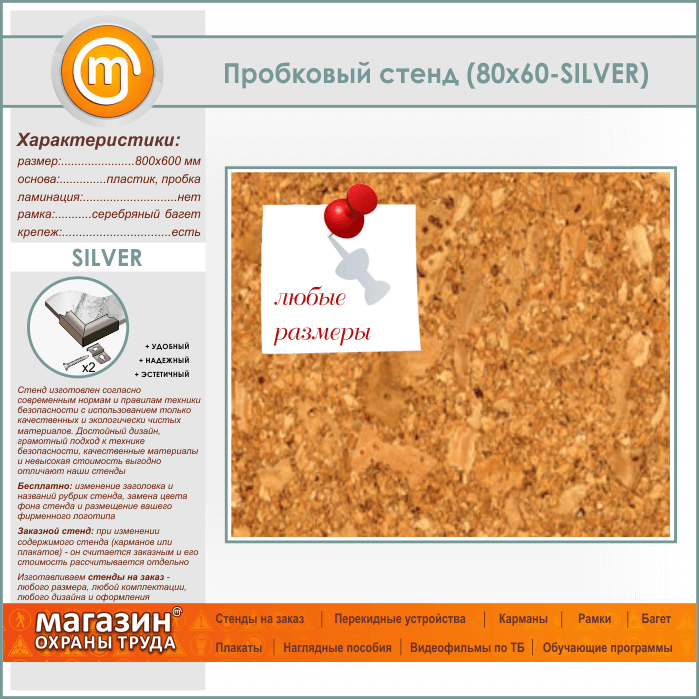 Пробковая доска, 80х60 см (IN-05-SILVER) в Улан-Удэ купить