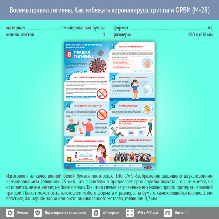 Плакат «Восемь правил гигиены. Как избежать коронавируса, гриппа и ОРВИ» (М-28, ламинированная бумага, А2, 1 лист) в Улан-Удэ купить