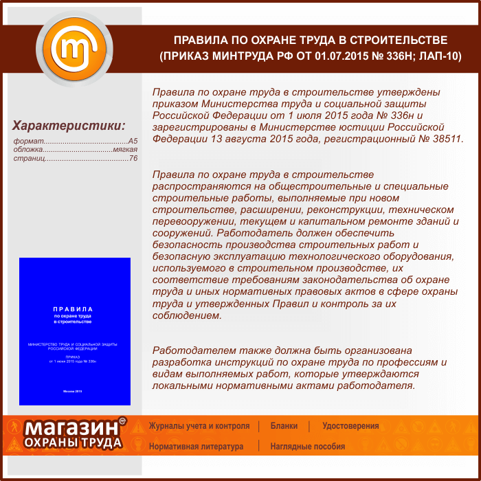 Правила по охране труда в строительстве (Приказ Минтруда РФ от 01.07.2015 № 336н) (ЛАП-10) в Улан-Удэ купить