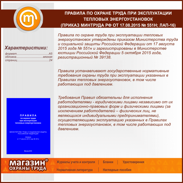 Правила по охране труда при эксплуатации тепловых энергоустановок (Приказ Минтруда РФ от 17.08.2015 № 551н) (ЛАП-16) в Улан-Удэ купить