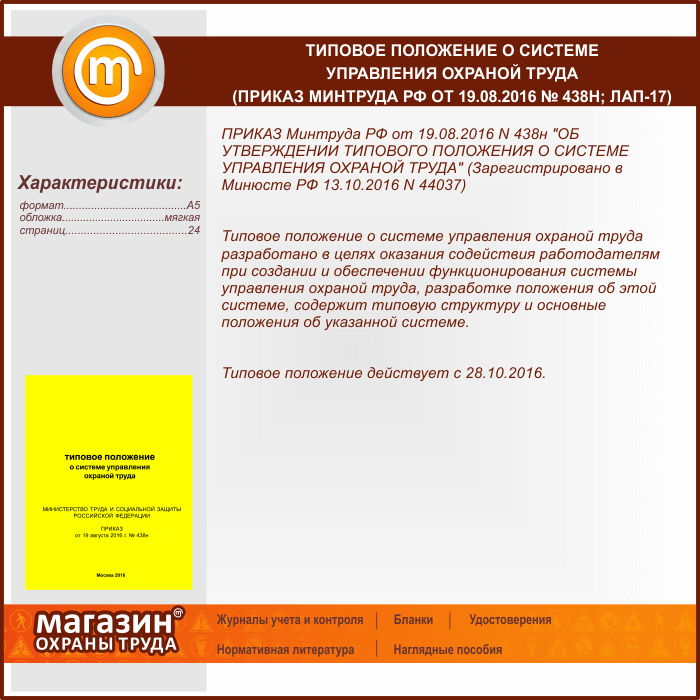 Типовое положение о системе управления охраной труда (Приказ Минтруда РФ от 19.08.2016 № 438н) (ЛАП-17) в Улан-Удэ купить