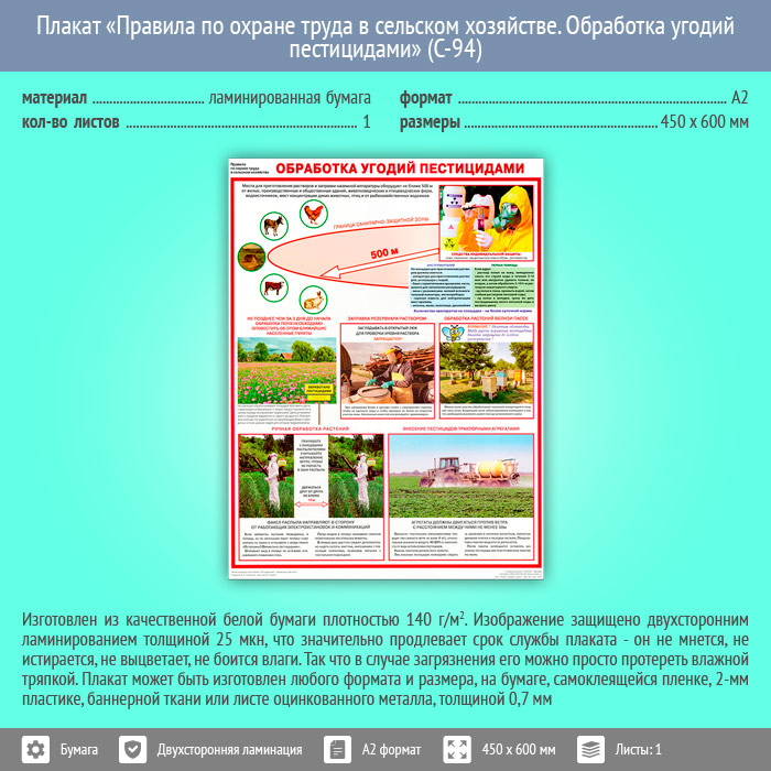 Плакат «Правила по охране труда в сельском хозяйстве. Обработка угодий пестицидами» (С-94, ламинированная бумага, А2, 1 лист) в Улан-Удэ купить