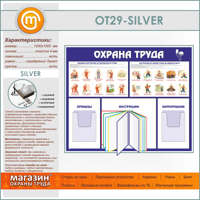 Стенд «Охрана труда» с перекидной системой и 2 объемными карманами (OT-29-SILVER) в Улан-Удэ купить