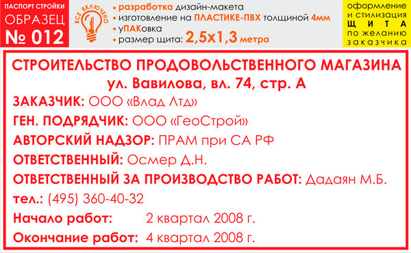 Паспорт стройки, образец № 12 (пластик 4 мм, 2500х1300 cм) в Улан-Удэ купить