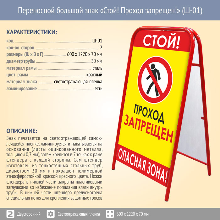 Переносной большой знак «Стой! Проход запрещен!» (Ш-01, двусторонний, светоотражающая пленка) в Улан-Удэ купить