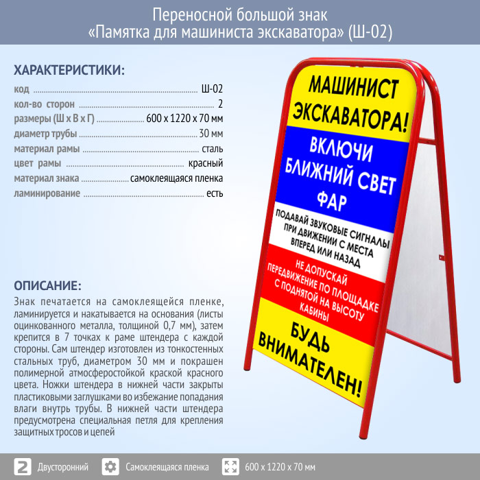 Переносной большой знак «Памятка для машиниста экскаватора» (Ш-02, двусторонний, самоклеящаяся пленка) в Улан-Удэ купить
