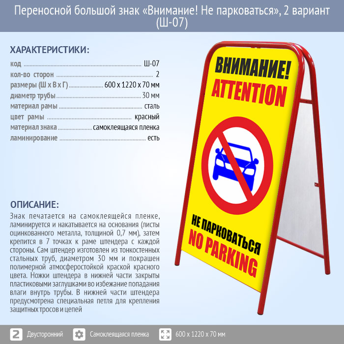 Переносной большой знак «Внимание! Не парковаться», 2 вариант (Ш-07, двусторонний, самоклеящаяся пленка) в Улан-Удэ купить