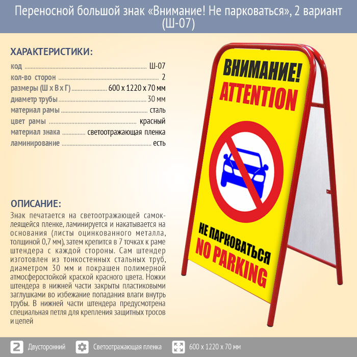 Переносной большой знак «Внимание! Не парковаться», 2 вариант (Ш-07, двусторонний, светоотражающая пленка) в Улан-Удэ купить