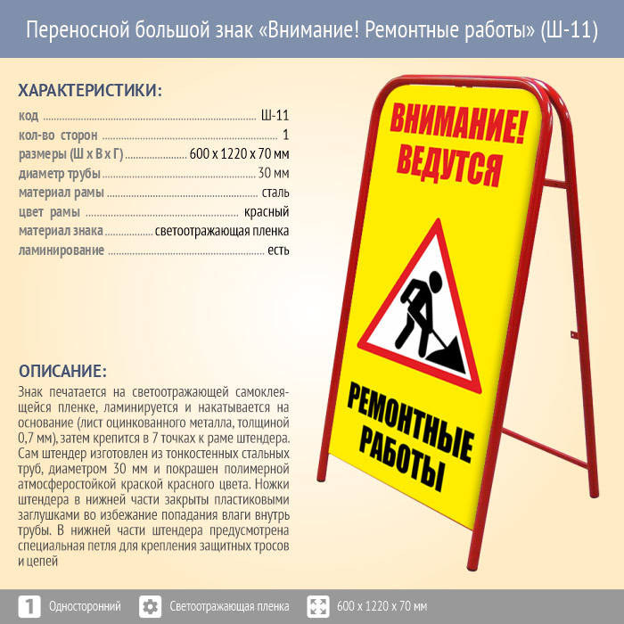 Переносной большой знак «Внимание! Ремонтные работы» (Ш-11, односторонний, светоотражающая пленка) в Улан-Удэ купить