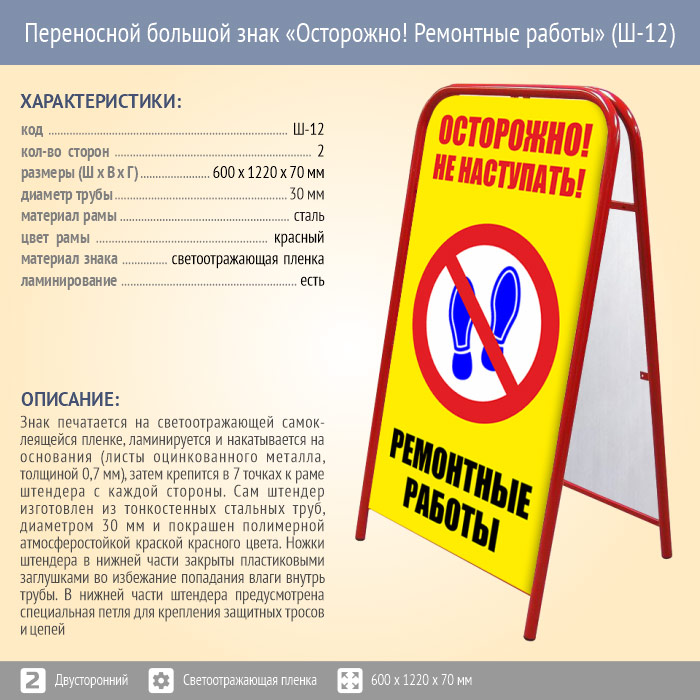 Переносной большой знак «Осторожно! Ремонтные работы» (Ш-12, двусторонний, светоотражающая пленка) в Улан-Удэ купить