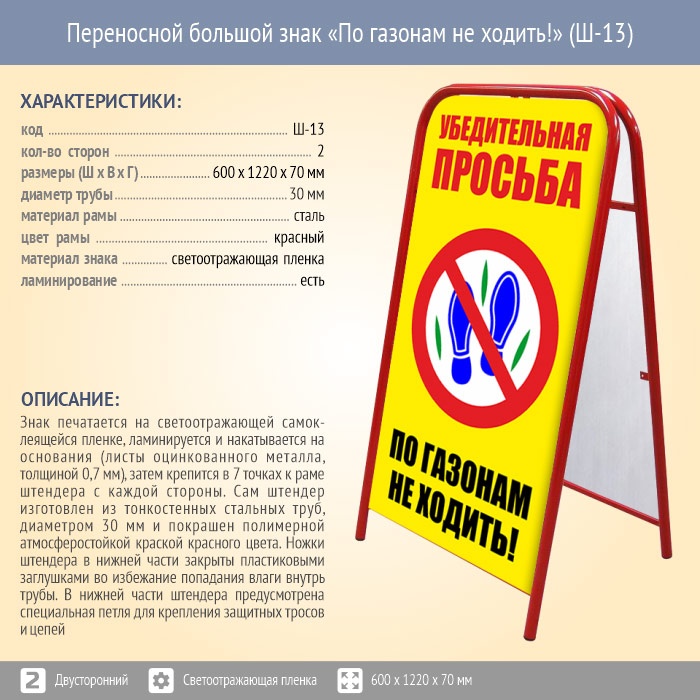 Переносной большой знак «По газонам не ходить!» (Ш-13, двусторонний, светоотражающая пленка) в Улан-Удэ купить