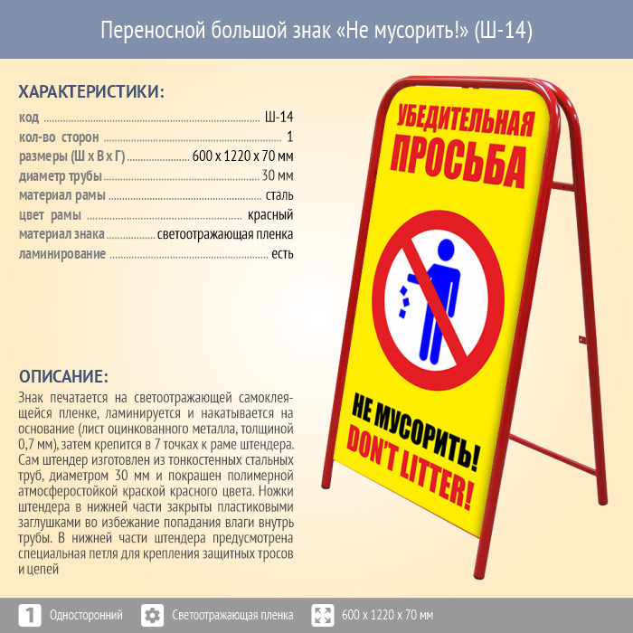 Переносной большой знак «Не мусорить!» (Ш-14, односторонний, светоотражающая пленка) в Улан-Удэ купить