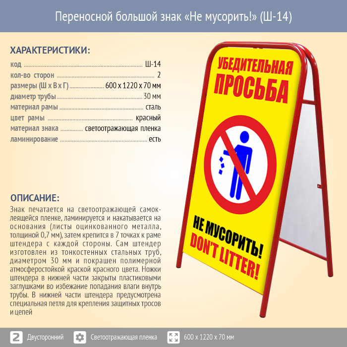 Переносной большой знак «Не мусорить!» (Ш-14, двусторонний, светоотражающая пленка) в Улан-Удэ купить
