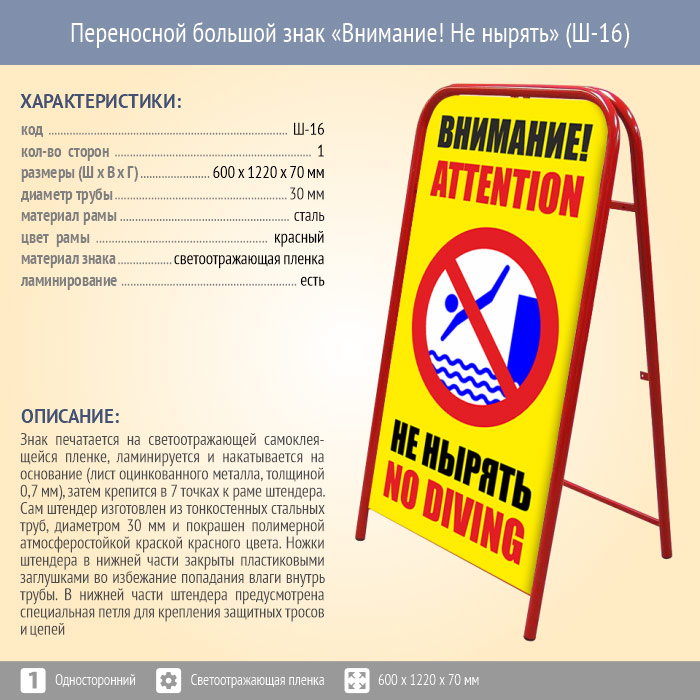 Переносной большой знак «Внимание! Не нырять» (Ш-16, односторонний, светоотражающая пленка) в Улан-Удэ купить
