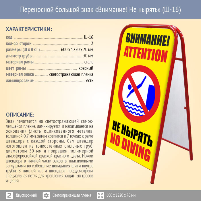 Переносной большой знак «Внимание! Не нырять» (Ш-16, двусторонний, светоотражающая пленка) в Улан-Удэ купить