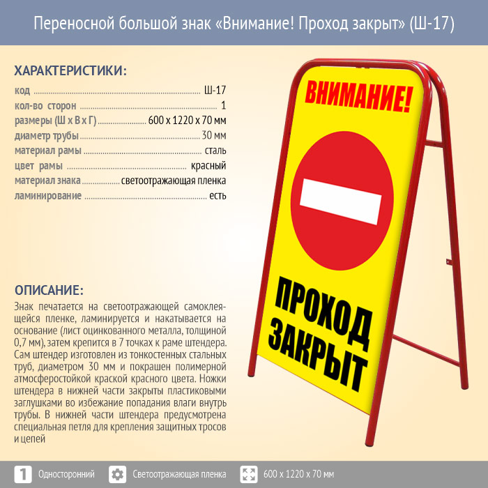 Переносной большой знак «Внимание! Проход закрыт» (Ш-17, односторонний, светоотражающая пленка) в Улан-Удэ купить