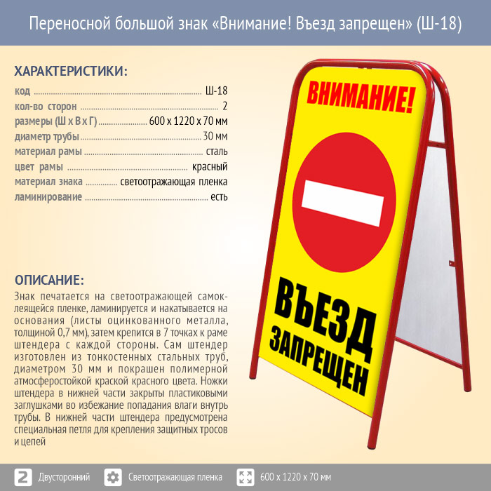 Переносной большой знак «Внимание! Въезд запрещен» (Ш-18, двусторонний, светоотражающая пленка) в Улан-Удэ купить