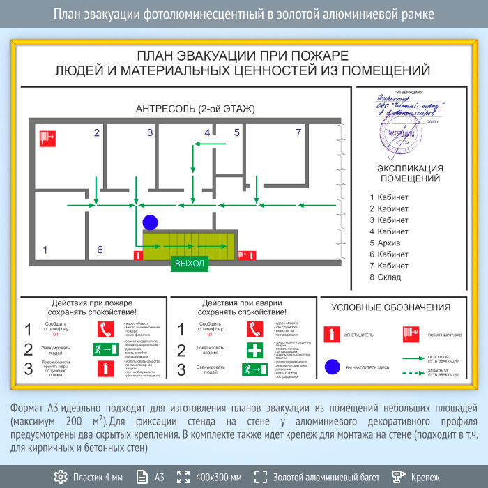 План эвакуации в золотой алюминиевой рамке (А3 формат) в Улан-Удэ купить
