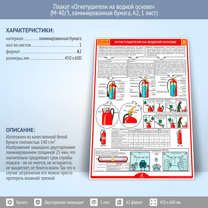 Плакат «Огнетушители на водной основе» (М-40/3, ламинированная бумага, А2, 1 лист) в Улан-Удэ купить