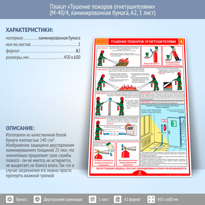 Плакат «Тушение пожаров огнетушителями» (М-40/4, ламинированная бумага, А2, 1 лист) в Улан-Удэ купить
