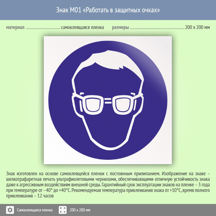 Знак M01 «Работать в защитных очках» (пленка, 200х200 мм) в Улан-Удэ купить