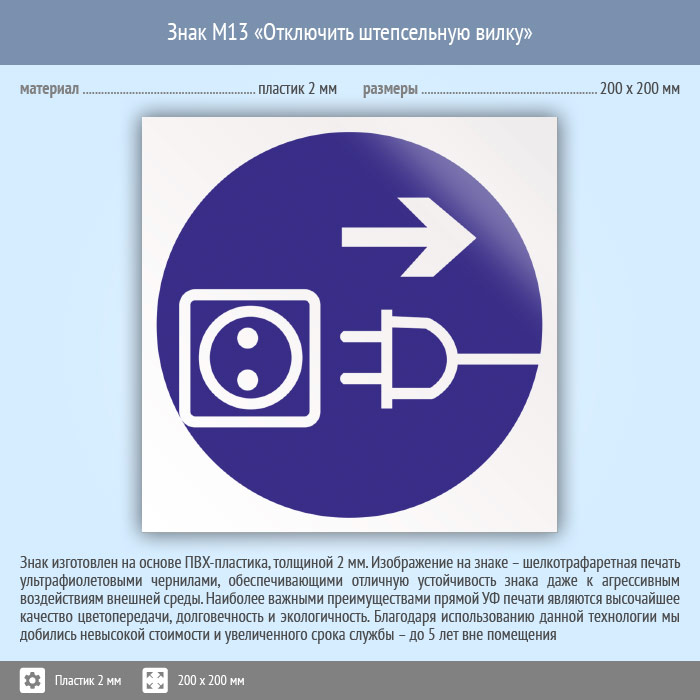 Знак M13 «Отключить штепсельную вилку» (пластик, 200х200 мм) в Улан-Удэ купить