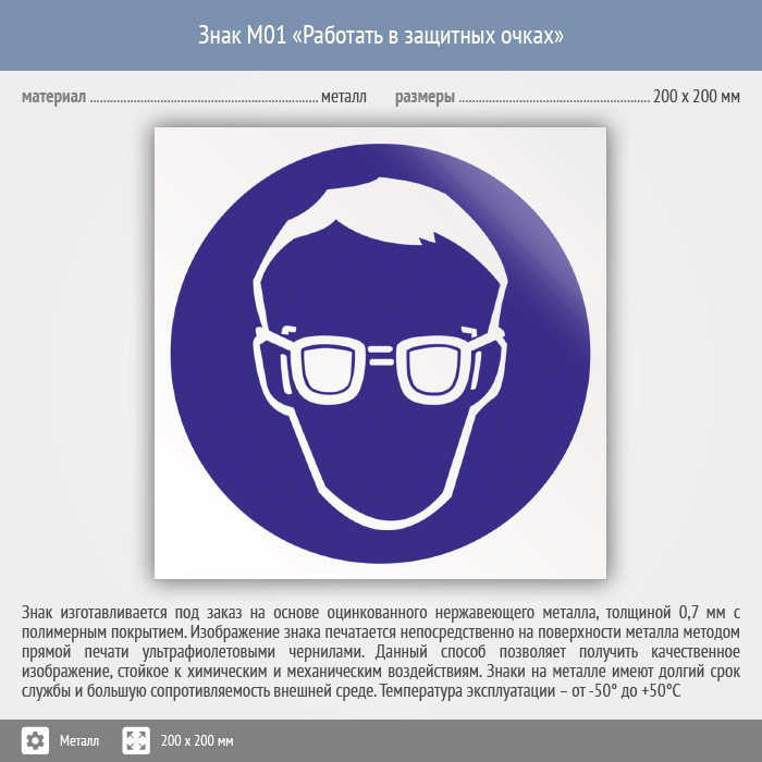 Знак M01 «Работать в защитных очках» (металл, 200х200 мм) в Улан-Удэ купить