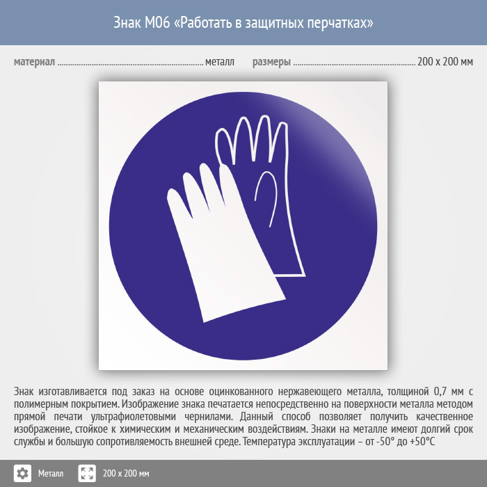 Знак M06 «Работать в защитных перчатках» (металл, 200х200 мм) в Улан-Удэ купить