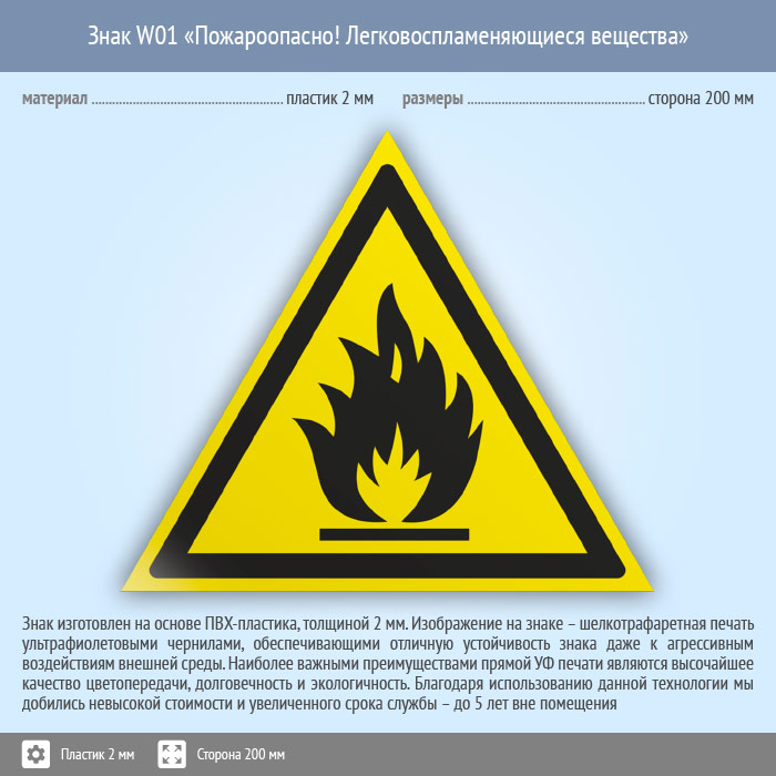 Знак W01 «Пожароопасно! легковоспламеняющиеся вещества» (пластик, сторона 200 мм) в Улан-Удэ купить