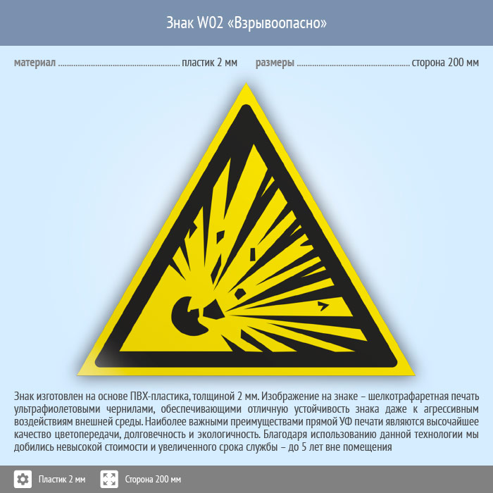 Знак W02 «Взрывоопасно» (пластик, сторона 200 мм) в Улан-Удэ купить