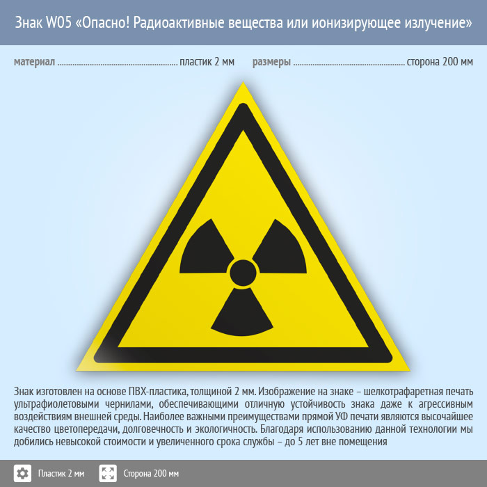 Знак W05 «Опасно! радиоактивные вещества или ионизирующее излучение» (пластик, сторона 200 мм) в Улан-Удэ купить