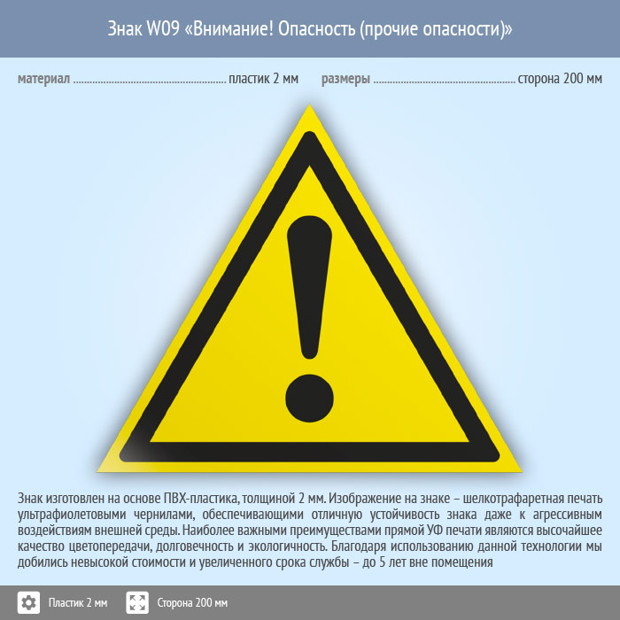 Знак W09 «Внимание! опасность (прочие опасности)» (пластик, сторона 200 мм) в Улан-Удэ купить