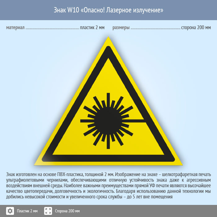 Знак W10 «Опасно! лазерное излучение» (пластик, сторона 200 мм) в Улан-Удэ купить