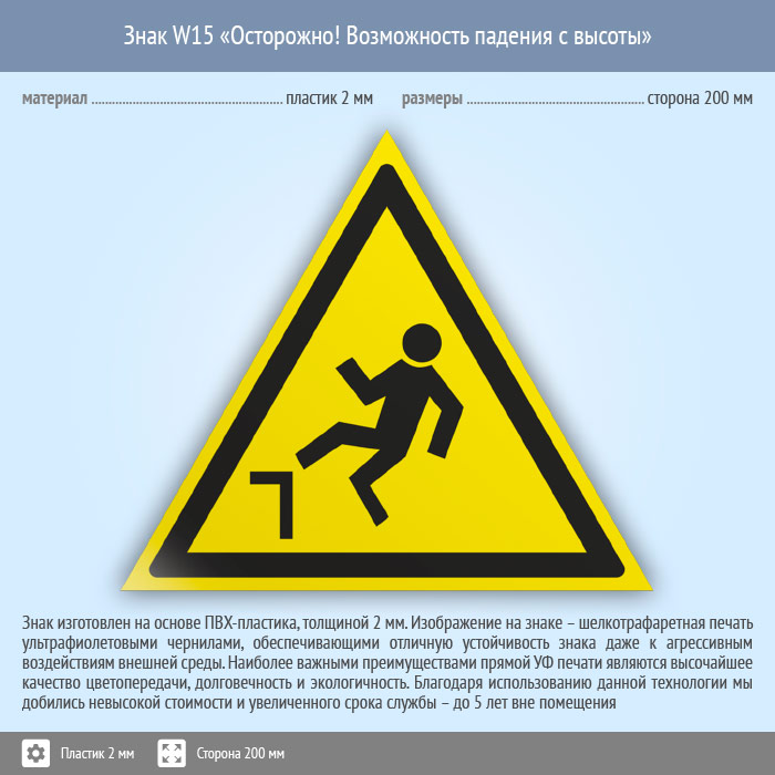 Знак W15 «Осторожно! возможность падения с высоты» (пластик, сторона 200 мм) в Улан-Удэ купить