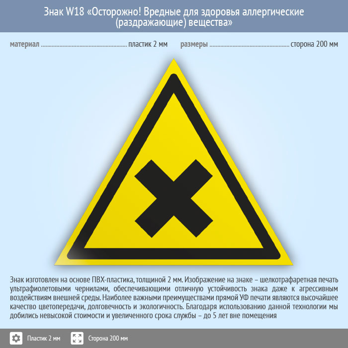 Знак W18 «Осторожно! вредные для здоровья аллергические (раздражающие) вещества» (пластик, сторона 200 мм) в Улан-Удэ купить