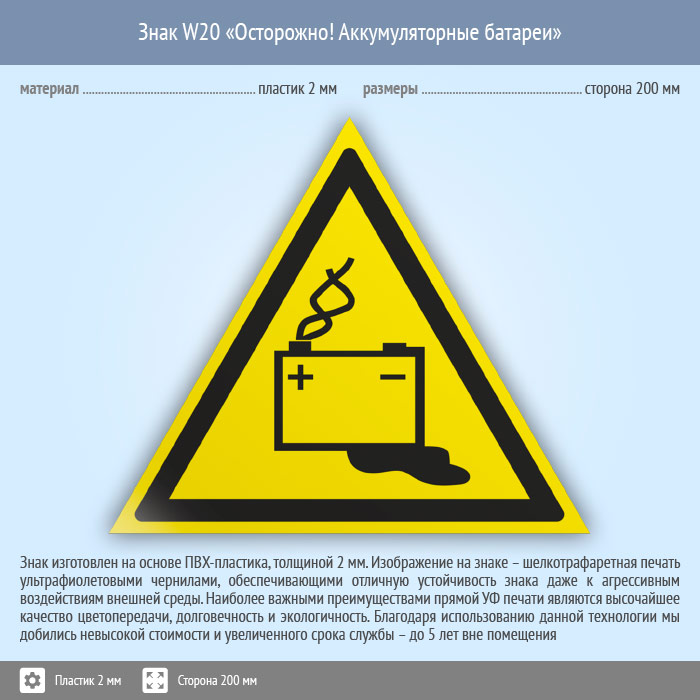 Знак W20 «Осторожно! аккумуляторные батареи» (пластик, сторона 200 мм) в Улан-Удэ купить